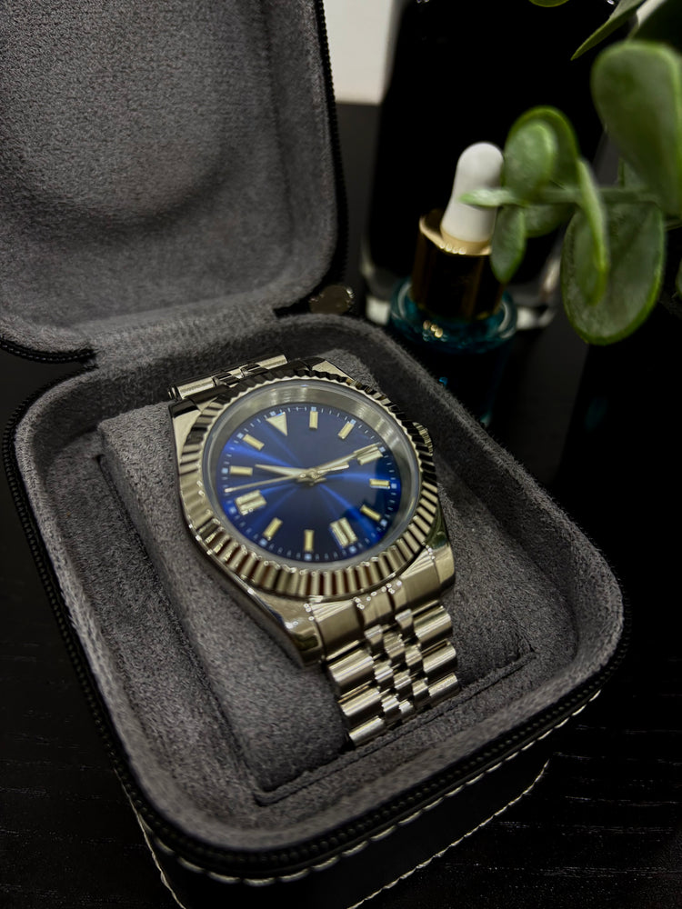 The Oceanic Radiance is a modern, elegant timepiece designed for those who appreciate clean lines, vibrant color, and mechanical craftsmanship. Its striking blue dial stands out beautifully against the polished silver‑tone stainless steel case and bracelet, creating a sophisticated yet contemporary look. Baton‑style hour markers and luminous hands ensure clarity in all lighting conditions, while the fluted bezel adds a touch of classic luxury.