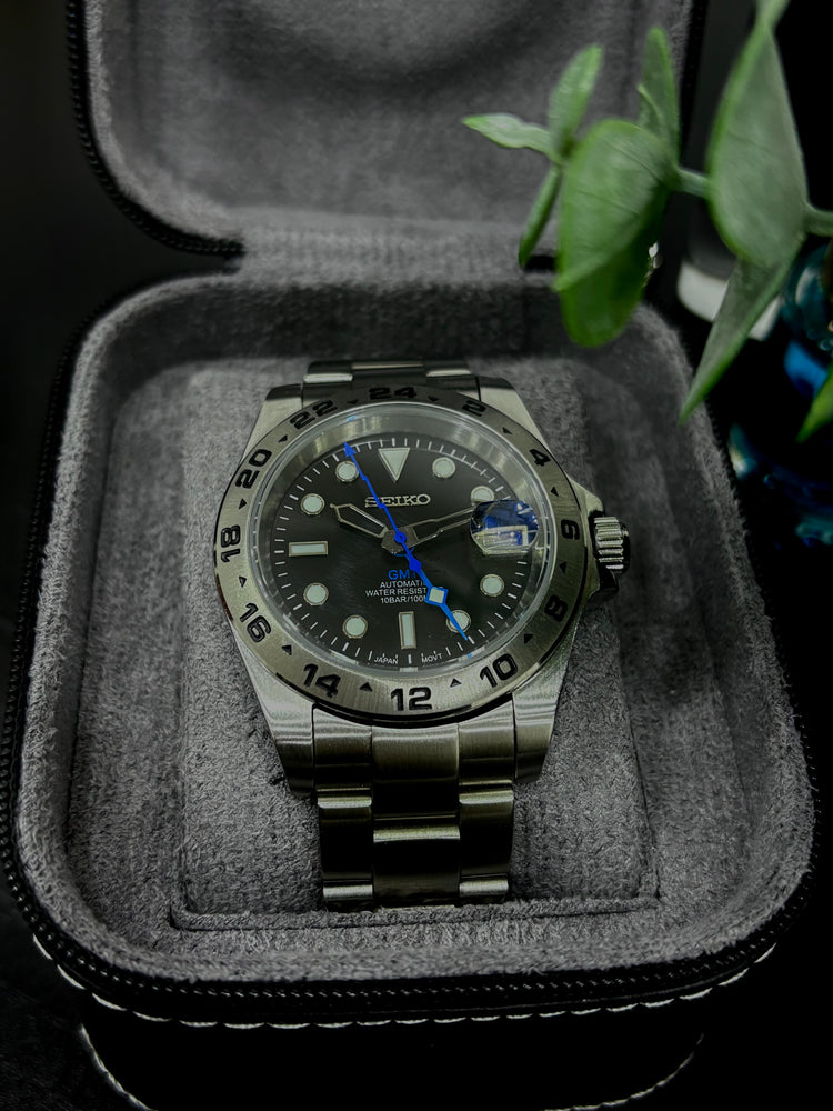 At its core is the reliable Seiko NH34 automatic GMT movement, allowing you to track a second time zone with ease — perfect for frequent travelers or international professionals. The fixed 24-hour bezel works seamlessly with the bold GMT hand, delivering clear and intuitive time zone tracking.